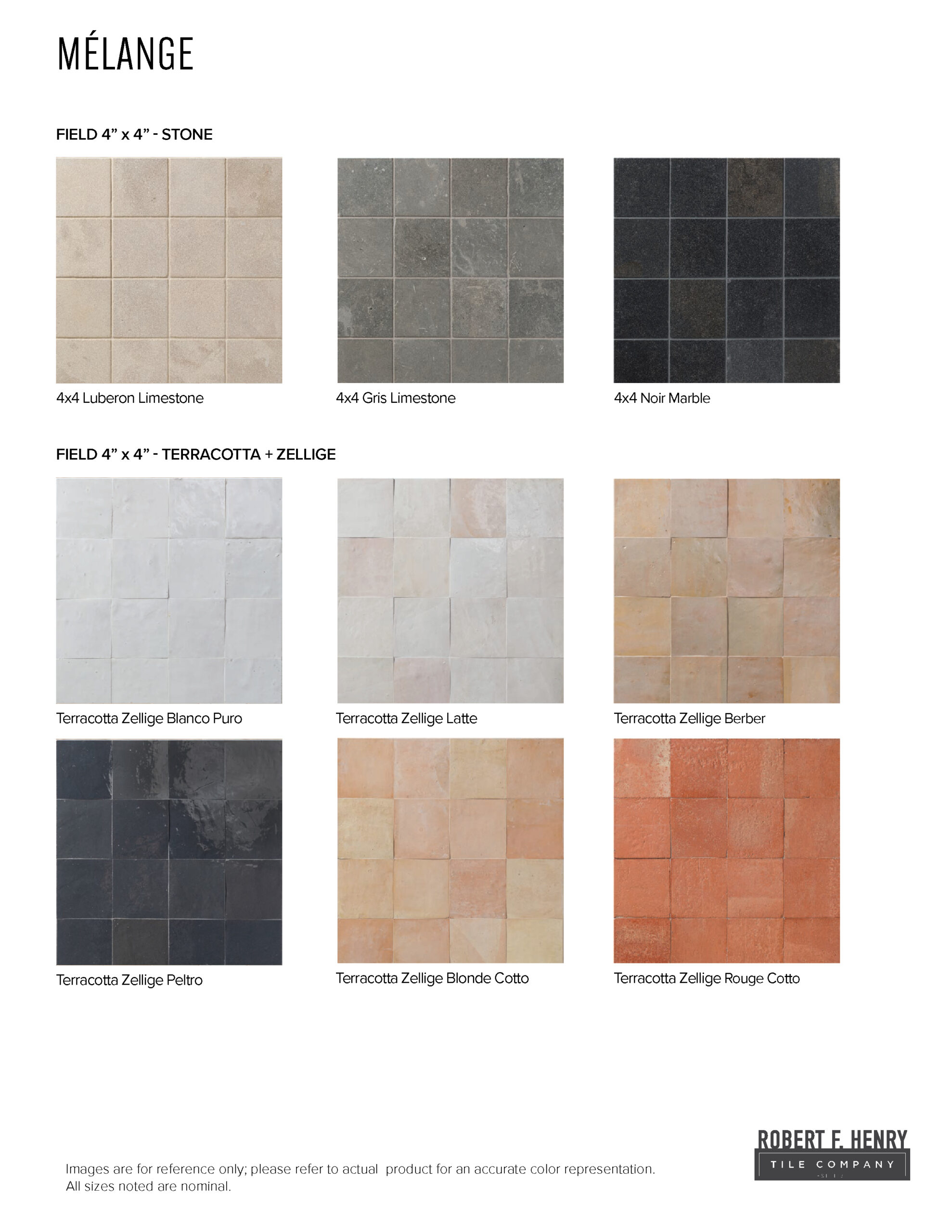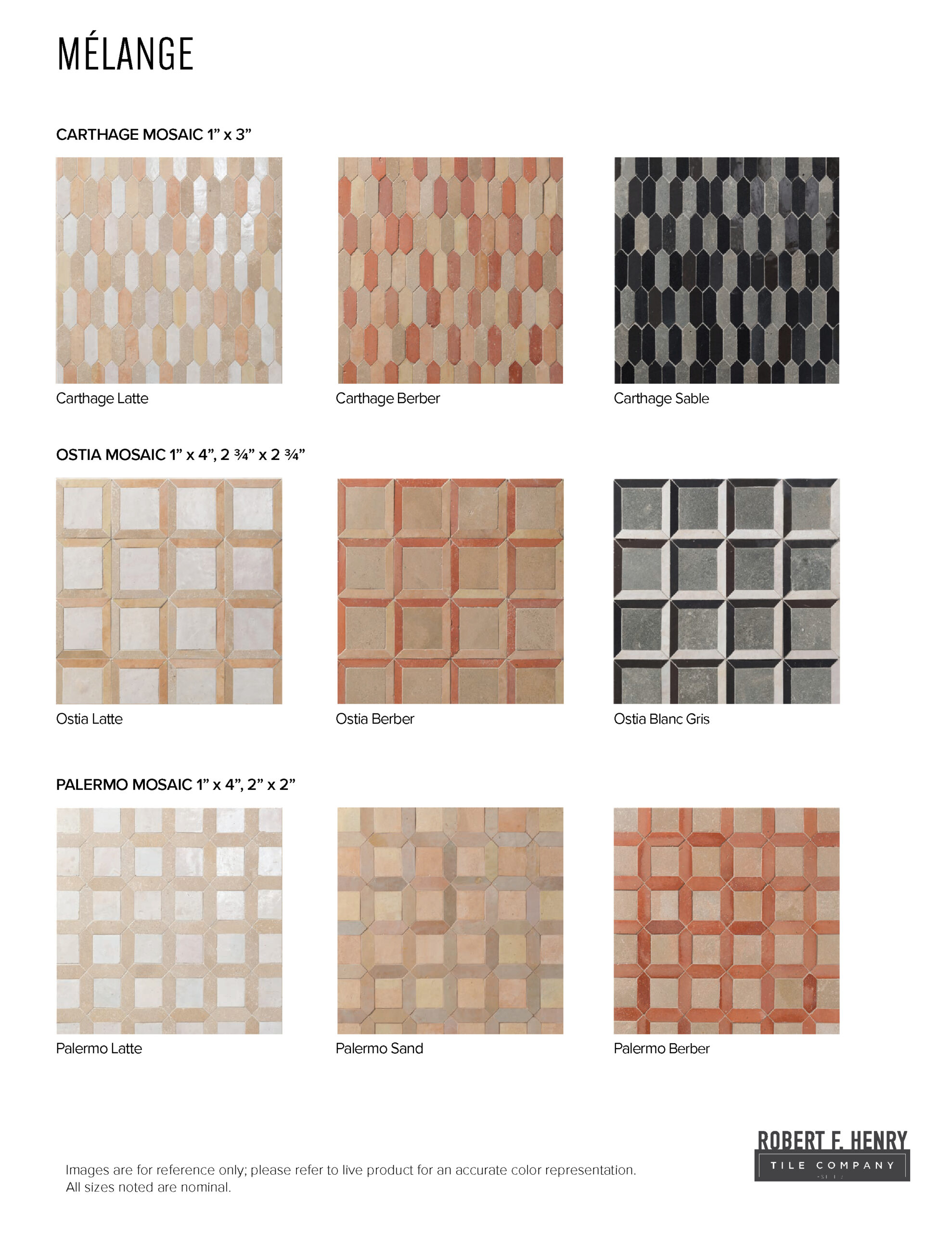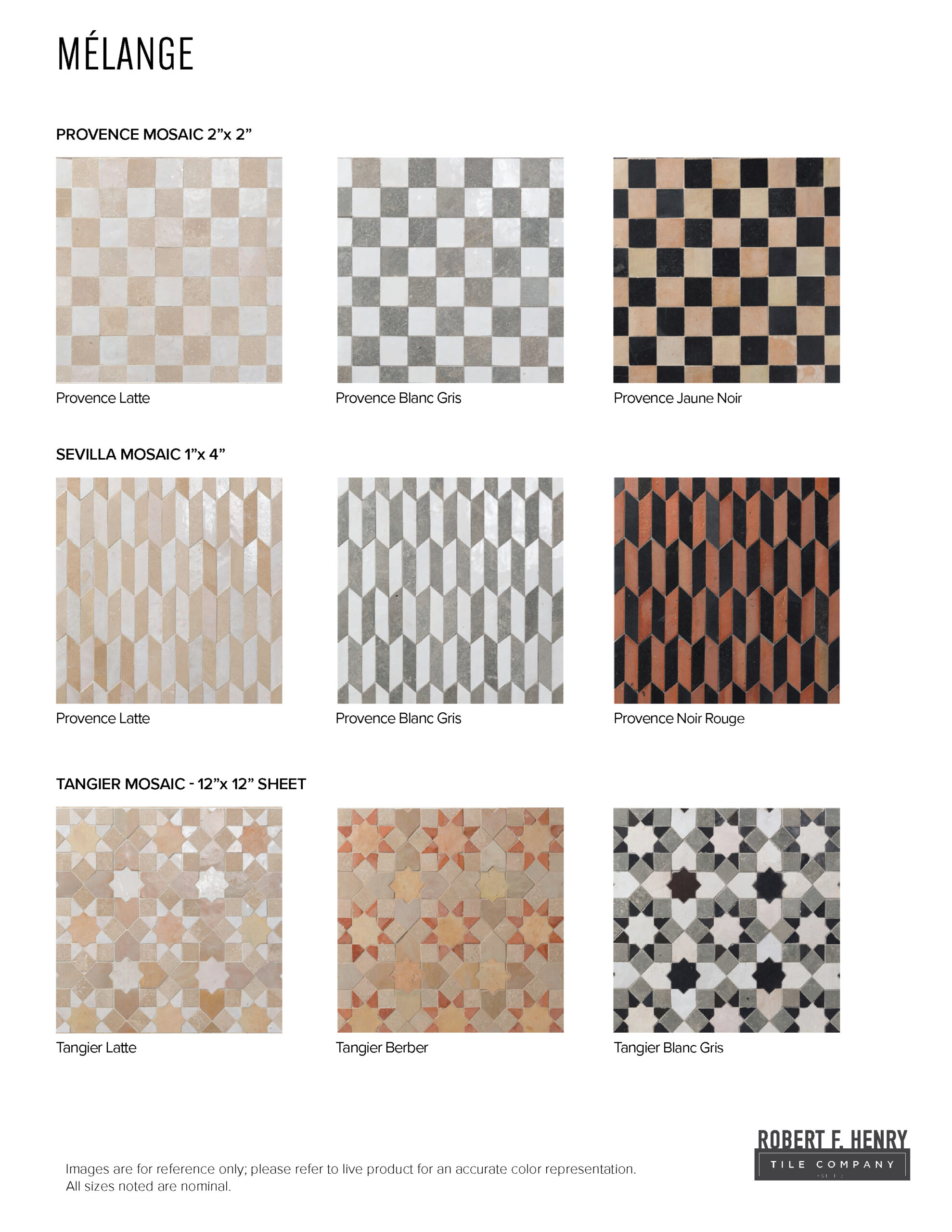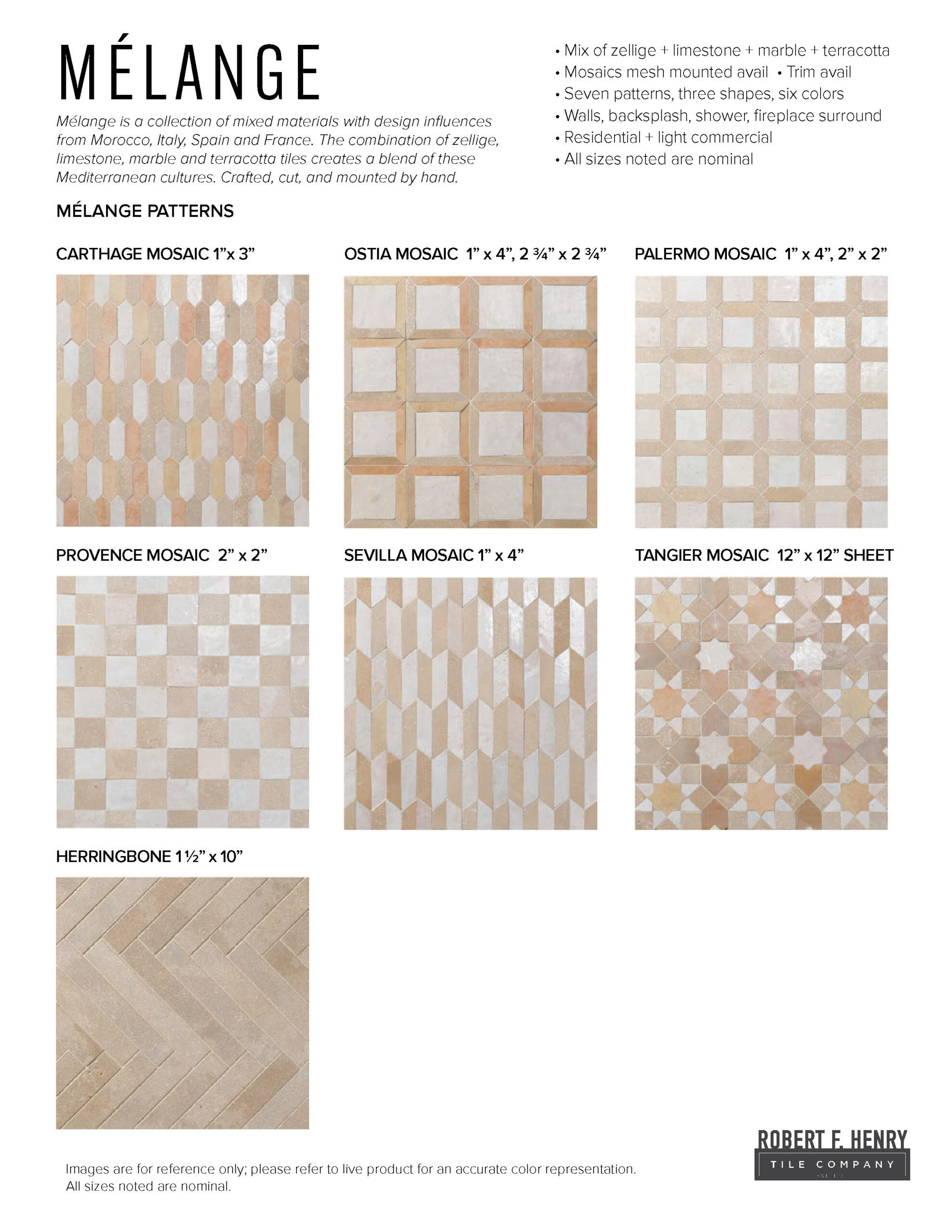 Mélange is a collection of mixed materials with design influences from Morocco, Italy, Spain and France. Crafted, cut, and mounted by hand. This special order line is exclusive to Robert F. Henry Tile.